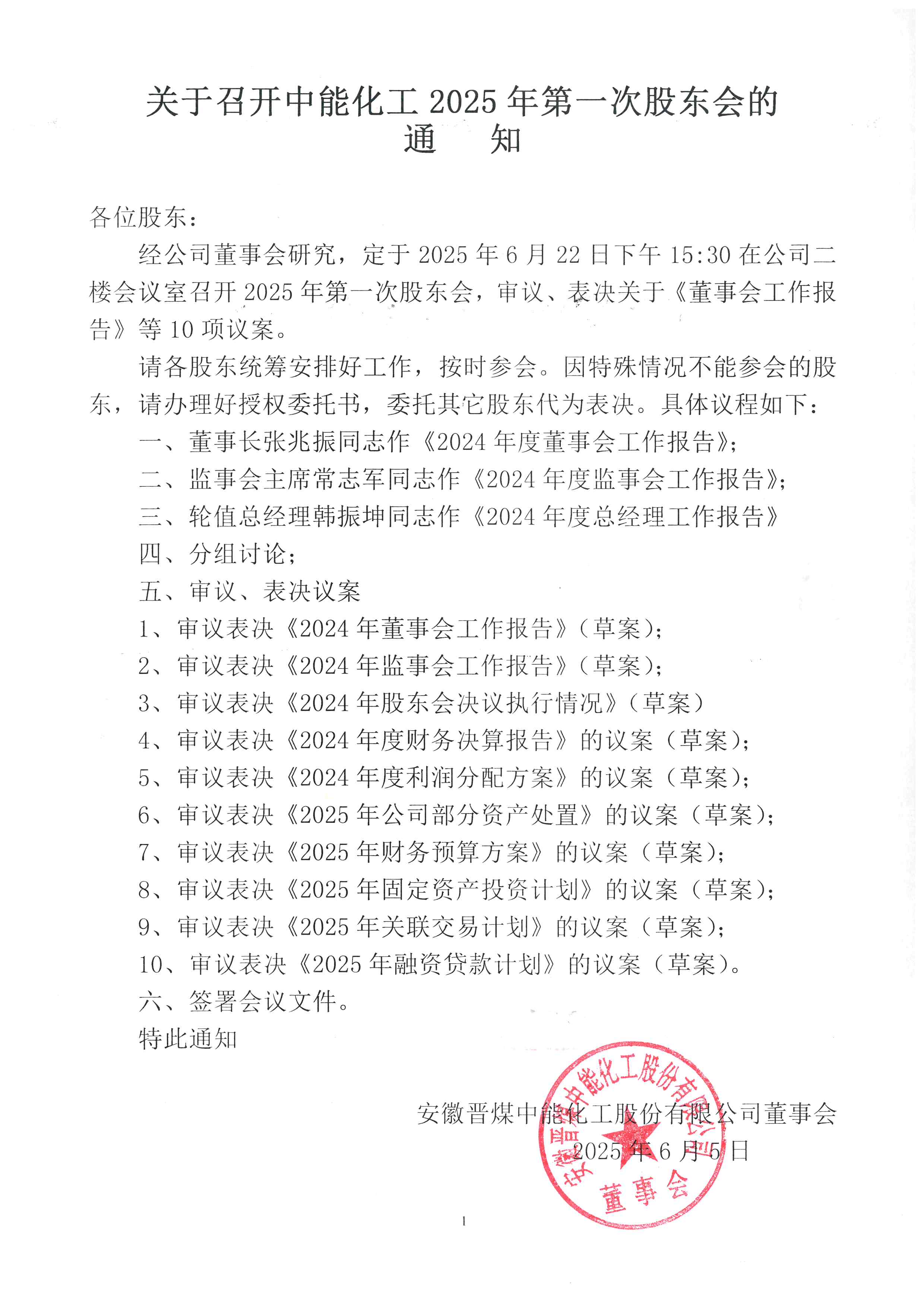 关于召开中能化工2025年第一次股东大会的通知